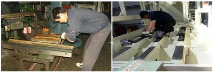 圖7: 12米龍門刨導軌劃傷,使用減摩涂層進行修復,減摩涂層固化后形成一種摩擦系數極小,而抗壓強度可達800Kg/cm 的涂層,并有效防止導軌運行中的“咬焊”現象。